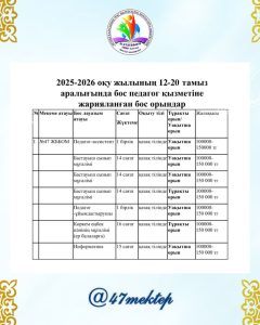 | 1 | № 47 ЖББОМ | Математика пәні мұғалімі | 15 сағат | қазақша | Декреттік орын | 180 000 |
